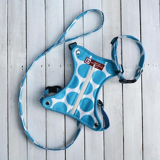 そして、エアコンの効いた車内やカフェに移動したりして、保冷剤入りのハーネスが必要ない時には首輪があると重宝します。