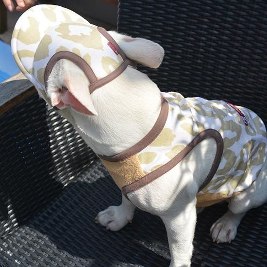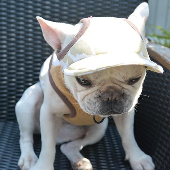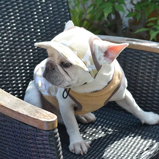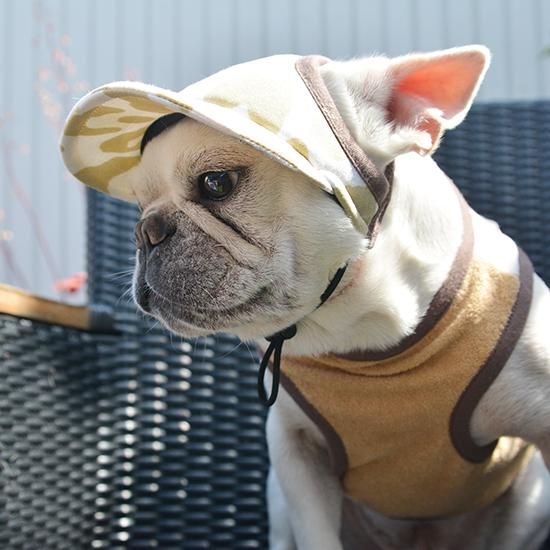 でも、毛色の濃いブリンドルやフォーンの子は太陽の熱を吸収しやすいので、キャップがあれば頭部に直射日光が当たるのを防いでくれるのです。もちろん、パイドやクリームの子にもオススメです。