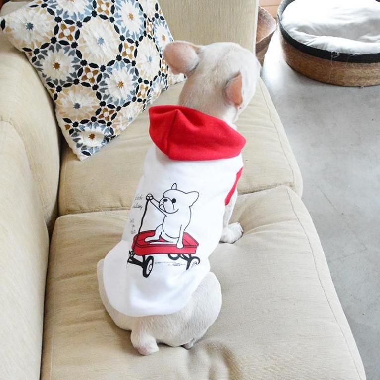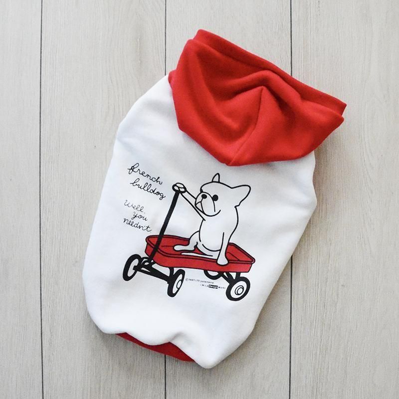赤いワゴン(ラジ◯フラ◯ヤー)に乗っているフレンチブルくんのイラストをプリントしたノースリーブパーカーです。