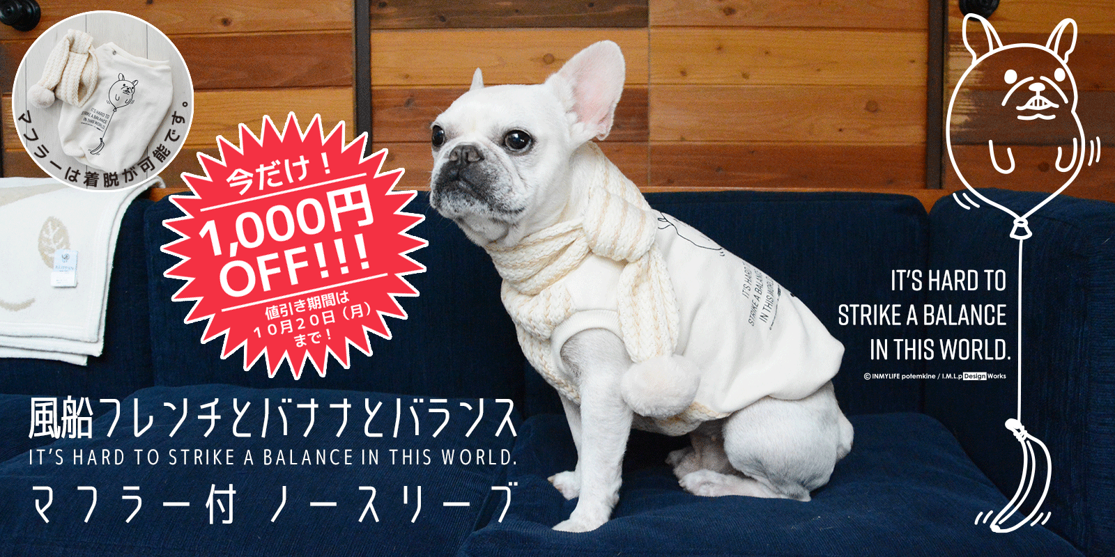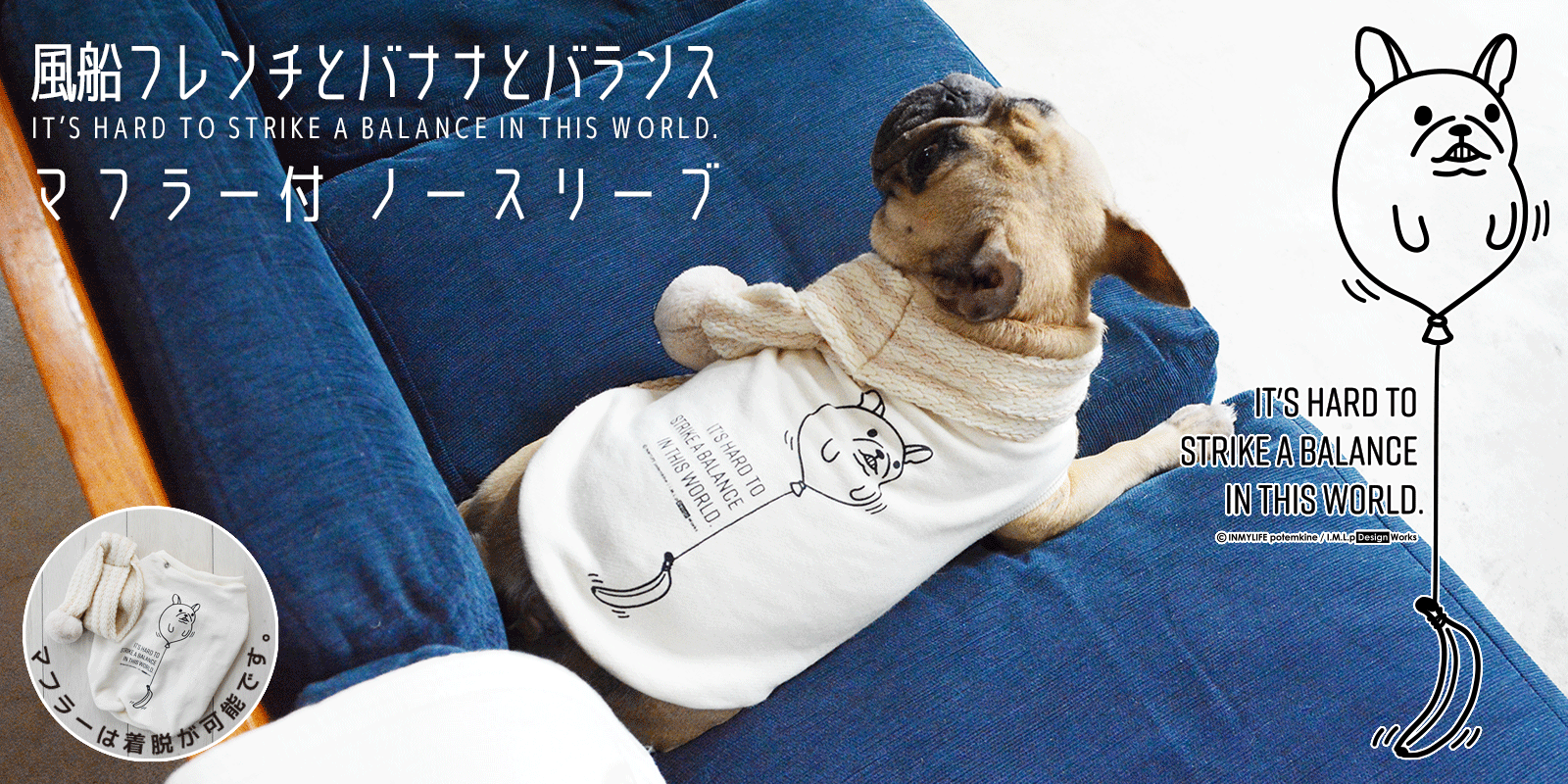 『風船フレンチとバナナとバランス マフラー付ノースリーブ』は、かぎ編み風ニット生地で作ったマフラーが付いている可愛い洋服です。