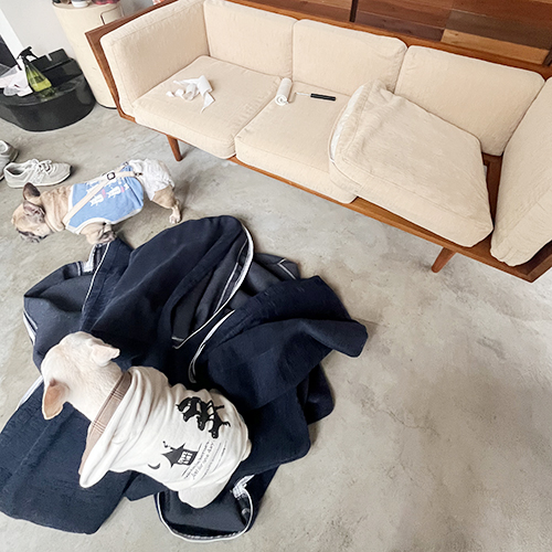 FACTORYのソファーのカバー替え。秋冬は紺、春夏は白に替えています。
