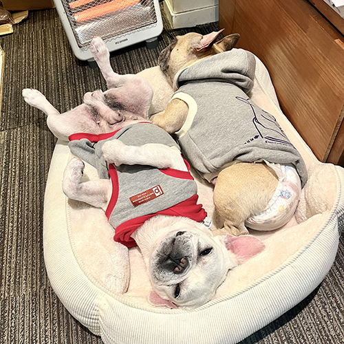 我が家の“ホワイトさんとブラウンさん”も電気ストーブの前でお昼寝です。