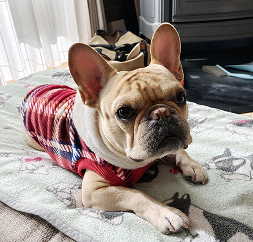 ブリンドルの毛色に赤チェックの組み合わせがオシャレです♪
